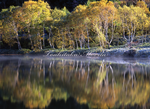 004963 黄葉の白樺林と霜の朝 志賀高原木戸池 長野県